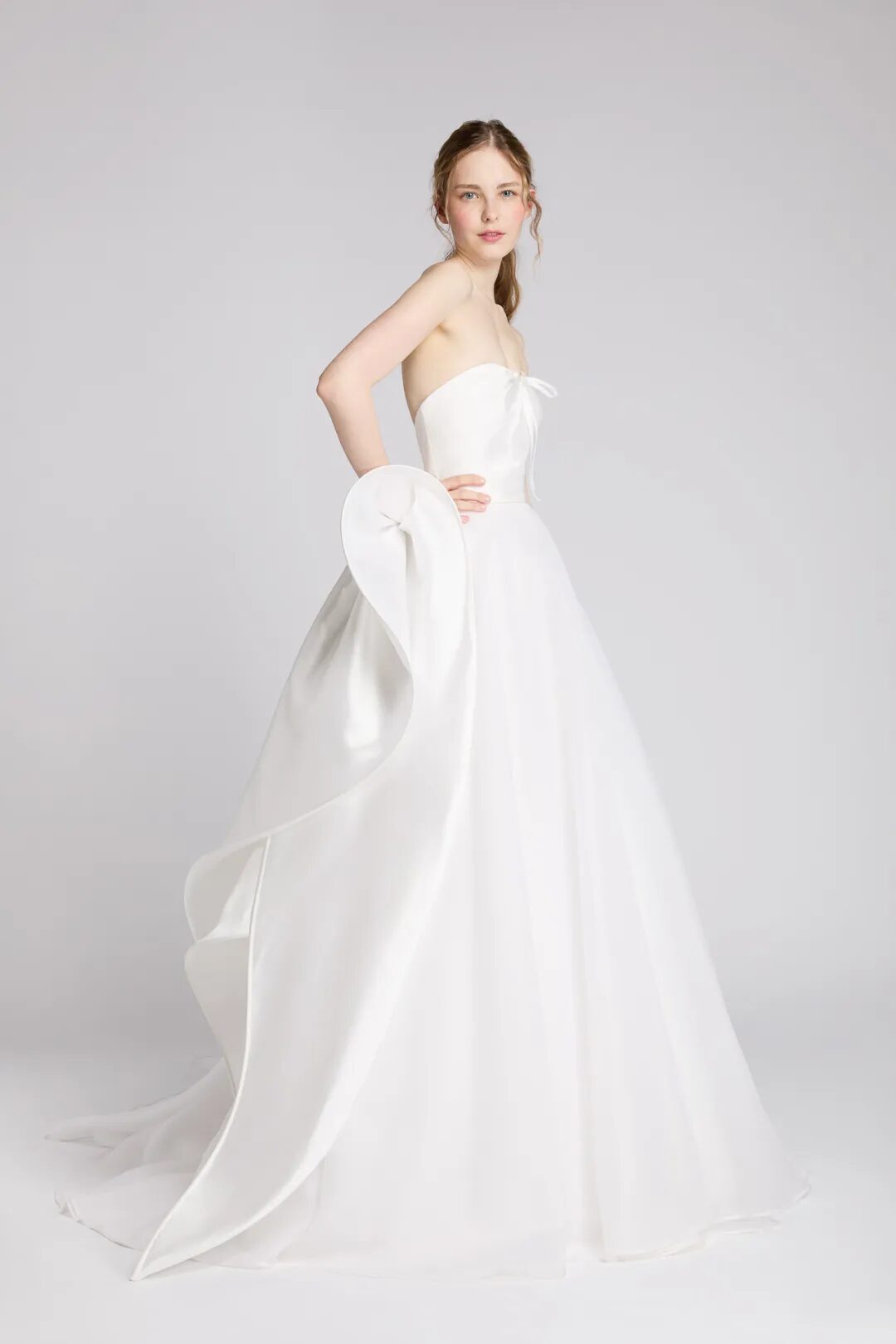 その最大の特徴は、立体的で彫刻のようなドレープやボリューム感のあるスカート、そしてミカドシルクを用いた上質で気品ある仕立てにあります。シンプルでありながらも圧倒的な存在感を放ち、花嫁を堂々とした主役へと引き立てます。高価な理由も、イタリア最高峰の素材と熟練した職人の技術による、精巧で美しい仕立てに裏打ちされています。