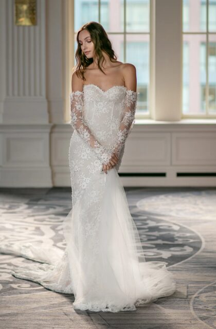 その最大の特徴は、女性の体のラインを美しく際立たせるフィット&フレアのシルエットや、繊細なレースと煌びやかなビーディングを組み合わせた、官能的でグラマラスなスタイルにあります。装飾性と女性らしさを絶妙に融合させたドレスは、花嫁を誰よりも印象的な存在へと導きます。高価な理由も、最高級の素材と、熟練の職人による丁寧なハンドメイドに裏打ちされています。