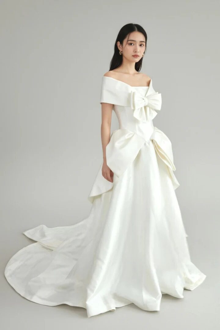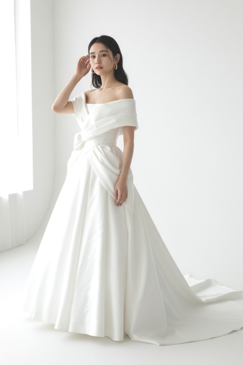 高貴な光沢を放つミカドシルクを贅沢に使用し、優雅なオフショルダーの大きな襟が顔まわりを華やかに見せる、ブランドを代表する一着です。