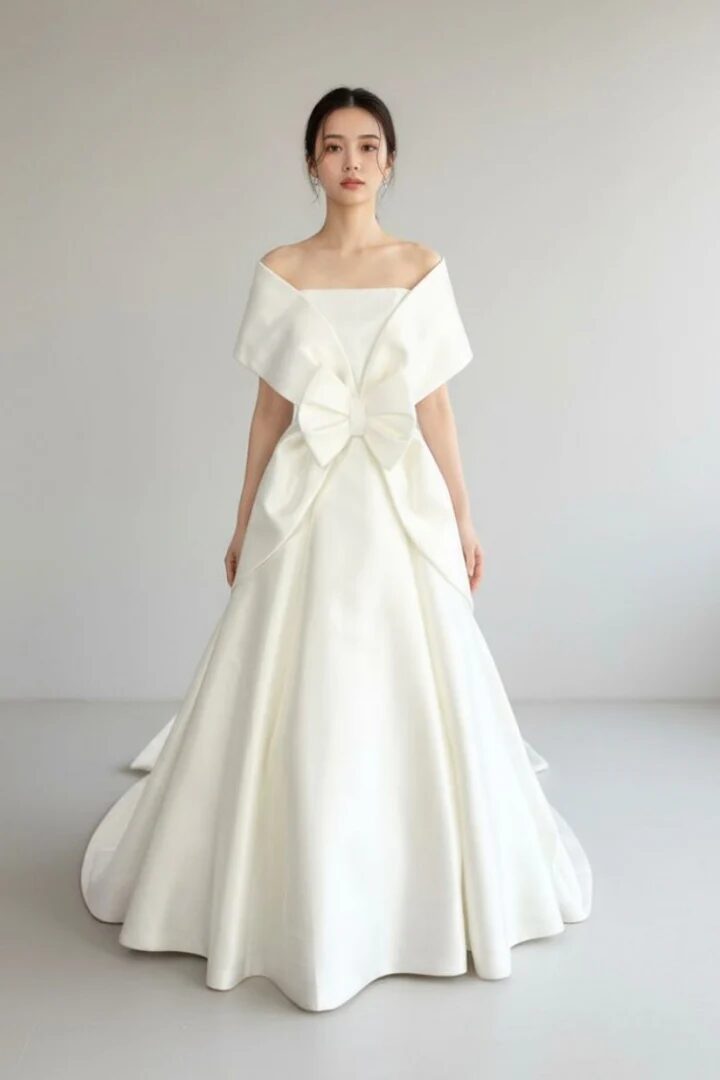 ブランドのアイコンであるケープカラーに、胸元と背中の両方に大きなリボンをあしらった、気品と可憐さが共存する人気のデザインです。