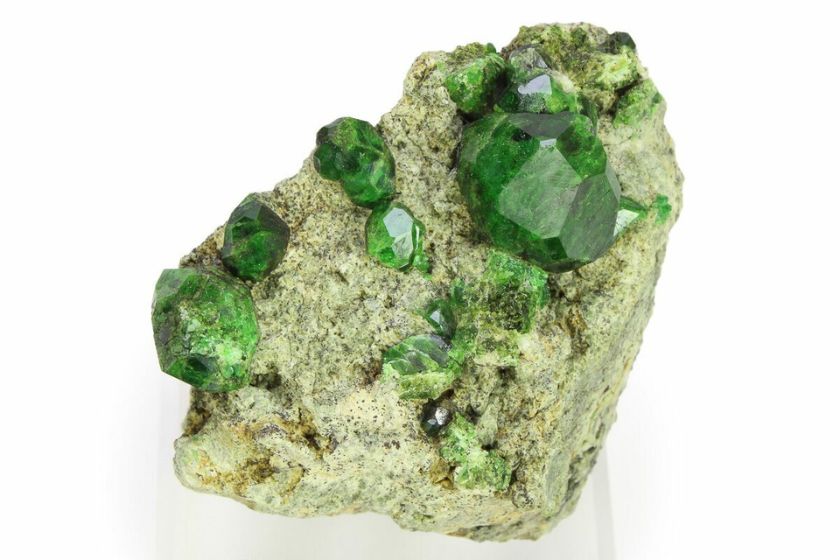 デマントイドガーネットは、鮮やかな緑色を特徴とし、高い光の分散率を持つことで知られています。そのため、ダイヤモンドのような輝きを持つ希少な宝石として人気があります。特にロシア産のものは高品質とされ、市場での価値も高くなります。