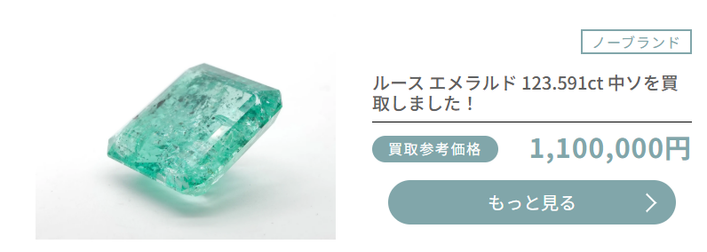 宝石としてのカットが難しい原石は、数千円から数万円程度の買取金額です。透明度が比較的高く、エメラルドらしい鮮やかな緑色が確認できる原石クラスになると、一気に買取価格が跳ね上がります。