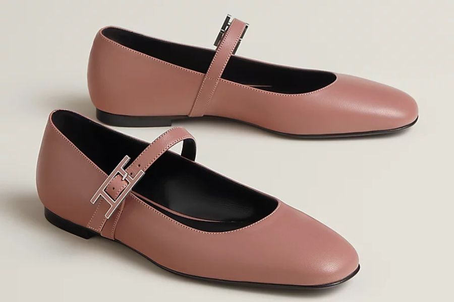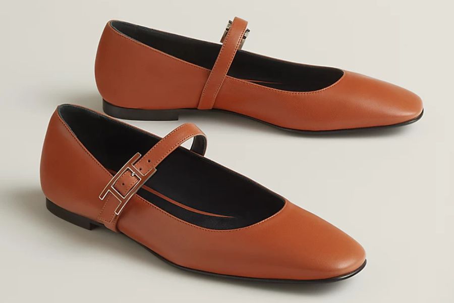 エルメスのバレエシューズ《ジェーン》は、クラシックな「メリージェーン(Mary Jane)」の愛らしさに、エルメスらしい洗練を加えた一足です。アッパーにはしなやかなレザーを用い、足元をすっきりと美しく見せてくれるシルエットが特徴。シンプルなバレエシューズにストラップを配することで、安定感と程よいアクセントを添えています。