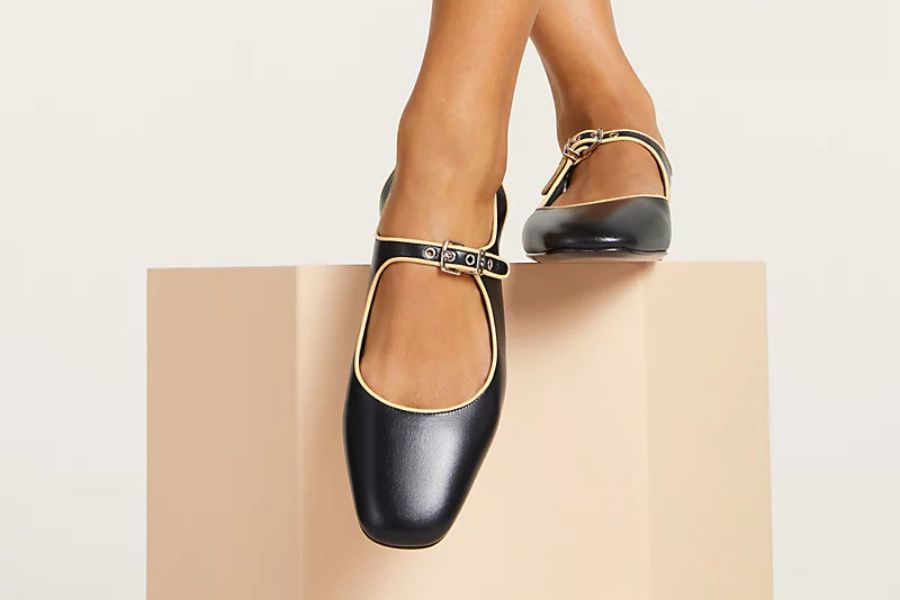 つま先はスクエア寄りの柔らかなフォルムで、クラシックさとモダンさが調和したデザイン。甲を横切る細めのストラップには小さなバックル金具があしらわれ、シンプルな中に上品なアクセントが加えられています。かかと側はスリング仕様で、軽やかさと安定感の両方を備えています。