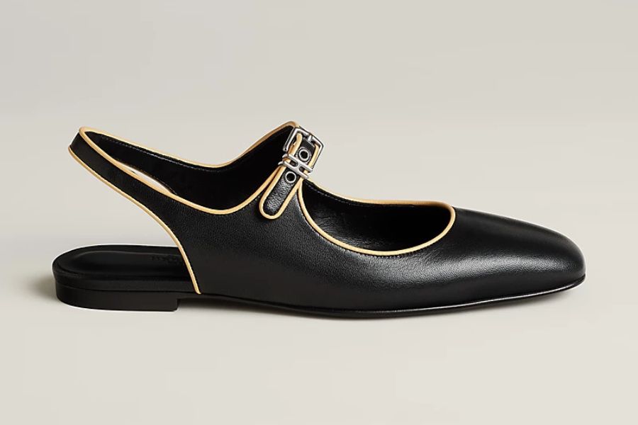 エルメスのバレエシューズ《クレオ》は、端正なシルエットと繊細なディテールが魅力のスリングバックデザインです。なめらかなブラックレザーに淡いベージュのパイピングを組み合わせることで、コントラストが生まれ、足元をすっきりと品よく見せてくれます。