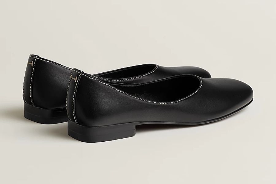 エルメスのバレエシューズ《リズ》は、極力装飾を抑えたプレーンな美しさに、エルメスらしい洗練を重ねた一足です。アッパーには柔らかなナッパレザーを用い、ラウンドトウの端正なシルエットが足元をすっきり見せてくれます。