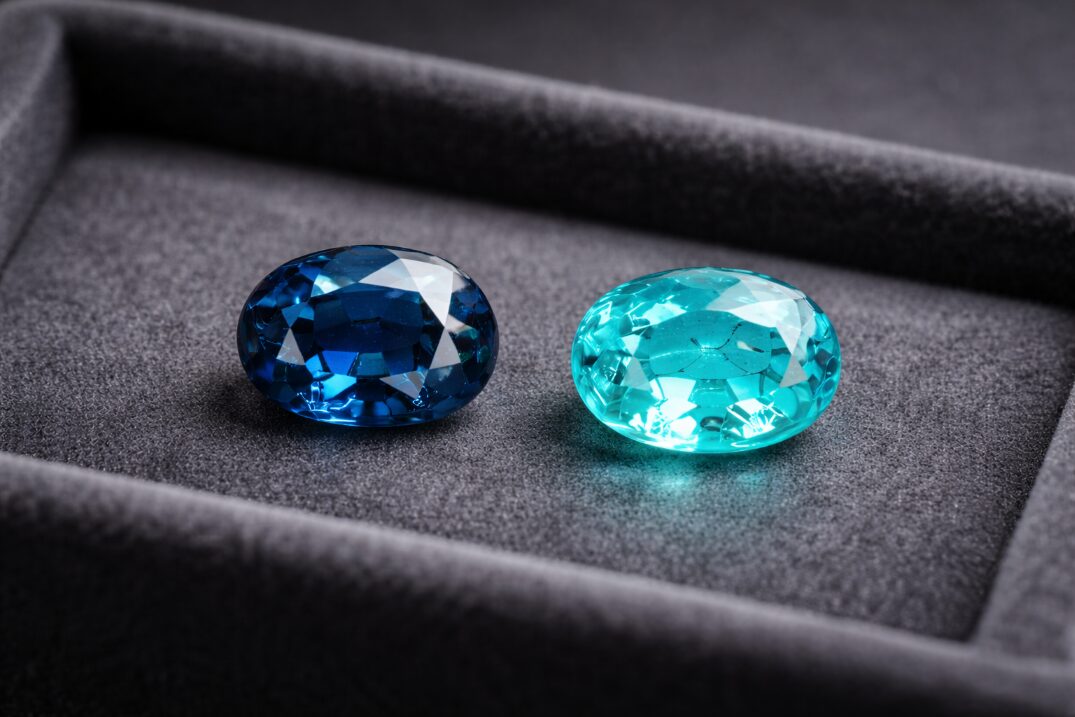 インディゴライトとパライバトルマリンのルースを並べた比較写真。左が落ち着いた青のインディゴライト、右がネオンブルーのパライバ