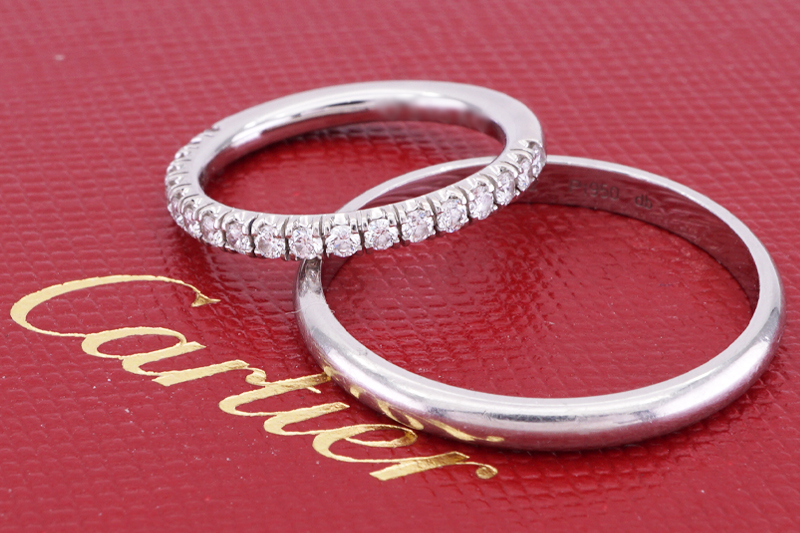カルティエのエンゲージリング・マリッジリングなどの指輪であれば、大まかに2万円〜70万円ほどが買取価格の目安になります。比較的リーズナブルなダイヤモンドなしのマリッジリングであれば2万円前後、ダイヤモンドの評価が高いエンゲージリングであれば70万円以上の高価買取も期待できます。大まかな目安として、定価の約20%が買取価格とイメージしておくとわかりやすいでしょう。未使用品であれば定価の40%、デザイン性に優れた人気のリングであれば定価に近い買取価格となるケースもあります。