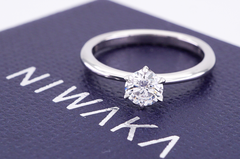 そして、俄ではダイヤモンドにも徹底したこだわりを持っています。ダイヤモンドの評価基準 4Cもグレードが高く、NIWAKA DIAMONDは他との違いがあります。正面から見ると、カットの中央に重なる2つの「正方形」が現れるのが特徴のひとつ。技術力の高い職人が「トリプルエクセレント」の評価を得ているダイヤを正方形が正面に見えるようにカットしているので、存在感があるダイヤの輝きを実現しています。