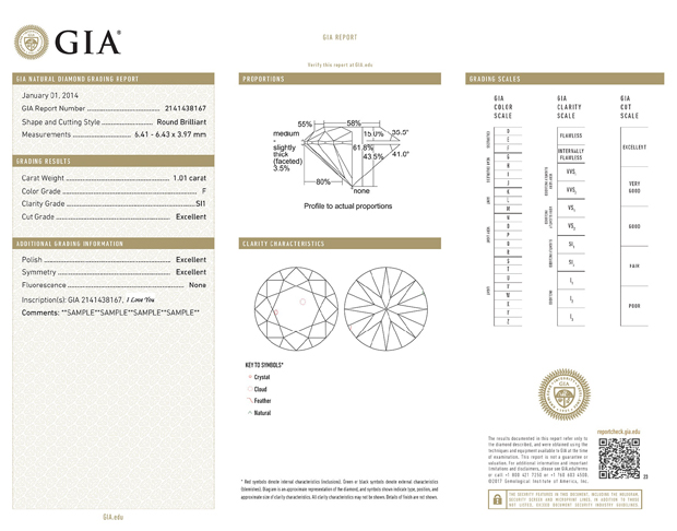 鑑定書とは、ダイヤモンドの品質「4C」を各鑑定機関によって発行される文書のことです。 この鑑定書は、ダイヤモンドが本物なのかどうかはもちろん、品質の良い悪い、価格が適正なのかを図る指標として使用されます。 カラット、カラー、クラリティ、カットなどの4C項目はもちろん、ダイヤモンドの寸法、ポリッシュ、 対称性など様々な特性の分析結果が記載されます。