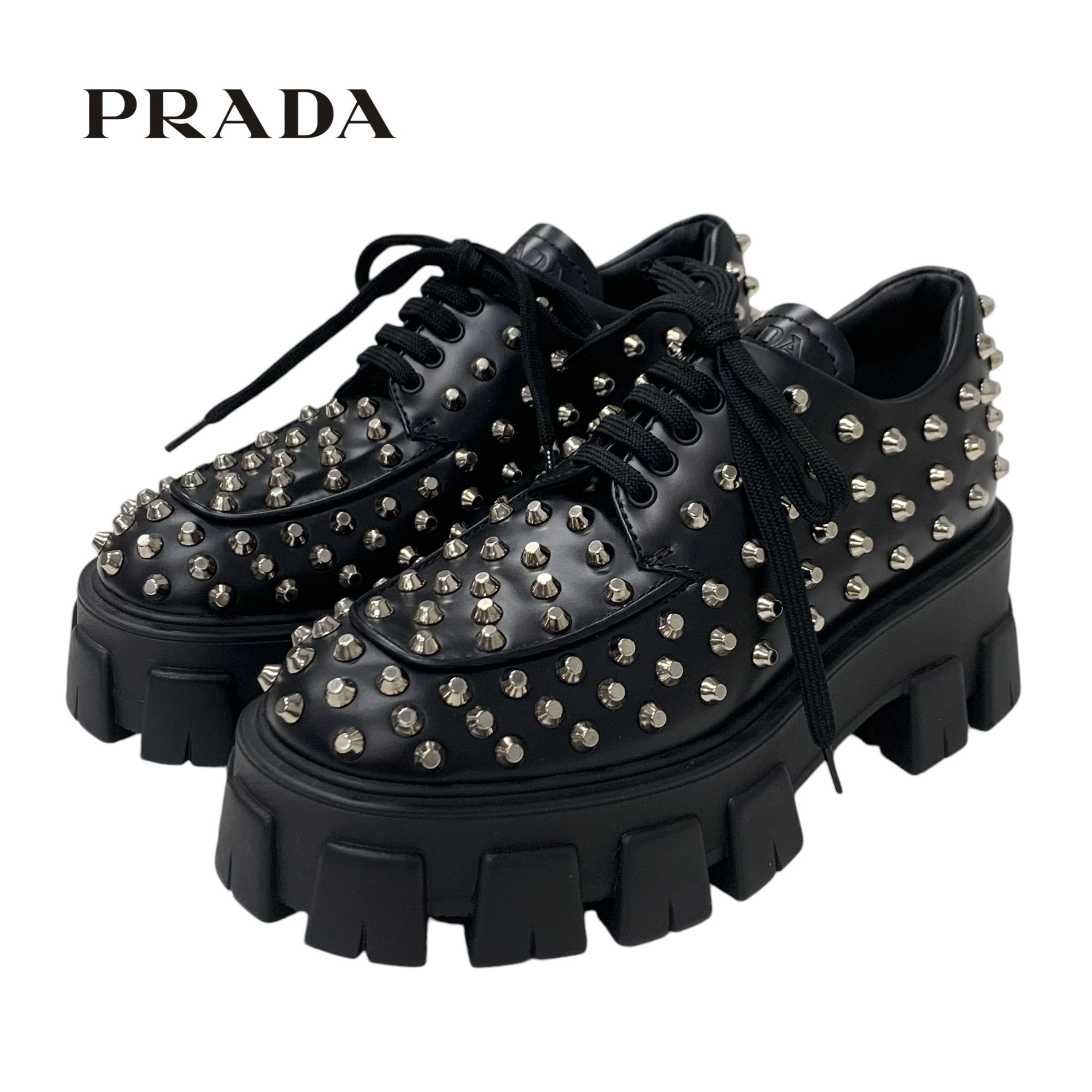 | 商品名 | プラダ モノリス レザー ロゴ スタッズ レースアップシューズ ブラック |
